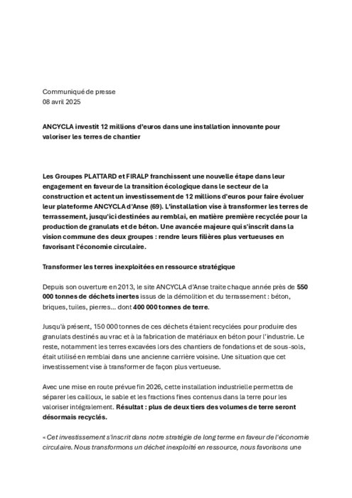 Les Groupes PLATTARD et FIRALP franchissent une nouvelle étape dans leur engagement en faveur de la transition écologique dans le secteur de la construction et actent un investissement de 12 millions d'euros pour faire évoluer leur plateforme ANCYCLA d'Anse (69). L’installation vise à transformer les terres de terrassement, jusqu'ici destinées au remblai, en matière première recyclée pour la production de granulats et de béton. Une avancée majeure qui s'inscrit dans la vision commune des deux groupes : rendre leurs filières plus vertueuses en favorisant l'économie circulaire.