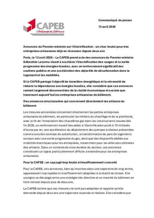 La CAPEB prend acte des annonces du Premier ministre Sébastien Lecornu visant à accélérer l’électrification des usages et la sortie progressive des énergies fossiles, avec un renforcement significatif des soutiens publics et une accélération des objectifs de décarbonation dans le logement et les mobilités.