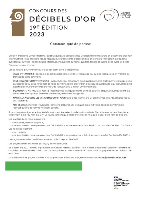 Créé en 1991 par le Conseil National du Bruit (CNB), le concours des Décibels d’Or consacrera en décembre prochain les industriels, élus, enseignants, concepteurs, représentants d’associations, chercheurs, Français et Européens, ayant fait preuve de réalisations significatives, innovantes ou remarquables dans le domaine de l’amélioration de l’environnement sonore.