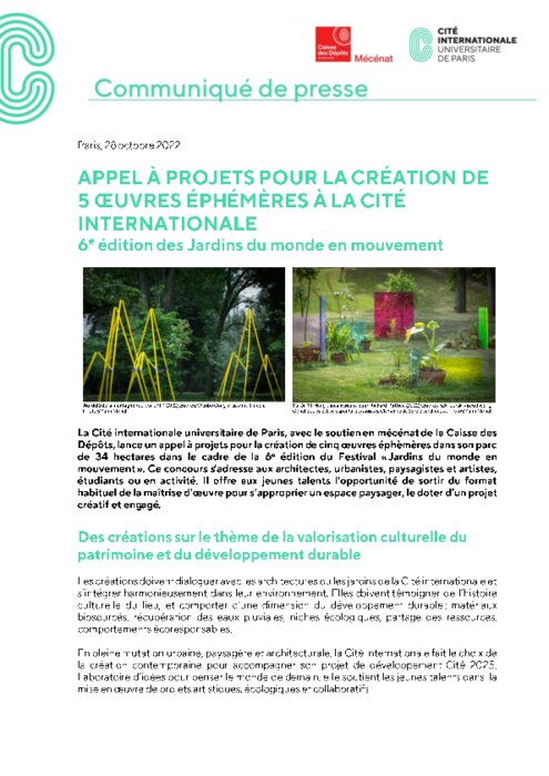 La Cité internationale universitaire de Paris, avec le soutien en mécénat de la Caisse des Dépôts, lance un appel à projets pour la création de cinq œuvres éphémères dans son parc de 34 hectares dans le cadre de la 6e édition du Festival « Jardins du monde en mouvement ». Ce concours s’adresse aux architectes, urbanistes, paysagistes et artistes, étudiants ou en activité. Il offre aux jeunes talents l’opportunité de sortir du format habituel de la maîtrise d’œuvre.