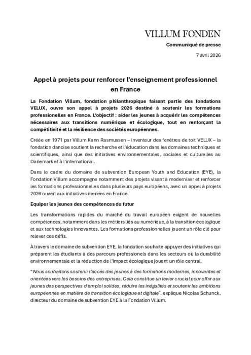 La Fondation Villum, fondation philanthropique faisant partie des fondations VELUX, ouvre son appel à projets 2026 destiné à soutenir les formations professionnelles en France. L’objectif : aider les jeunes à acquérir les compétences nécessaires aux transitions numérique et écologique, tout en renforçant la compétitivité et la résilience des sociétés européennes.