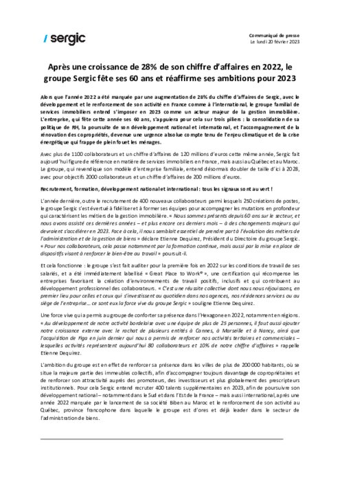 Alors que l’année 2022 a été marquée par une augmentation de 28% du chiffre d’affaires de Sergic, avec le