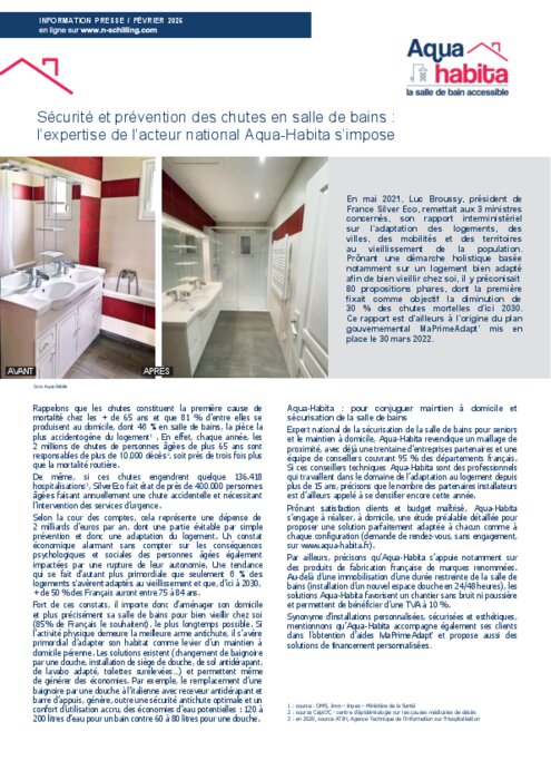 Les chutes constituent la première cause de mortalité chez les + de 65 ans et 81 % d’entre elles se produisent au domicile, dont 46 % en salle de bains, la pièce la plus accidentogène du logement. Prônant satisfaction clients et budget maîtrisé, Aqua-Habita s’engage à réaliser, à domicile, une étude préalable détaillée pour proposer une solution parfaitement adaptée à chacun comme à chaque configuration.
