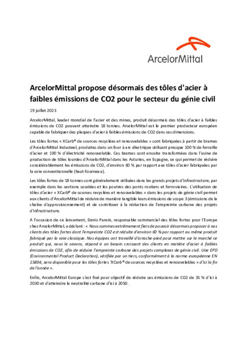 ArcelorMittal, leader mondial de l’acier et des mines, produit désormais des tôles d'acier à faibles émissions de CO2 pouvant atteindre 18 tonnes. ArcelorMittal est le premier producteur européen capable de fabriquer des plaques d'acier à faibles émissions de CO2 dans ces dimensions.