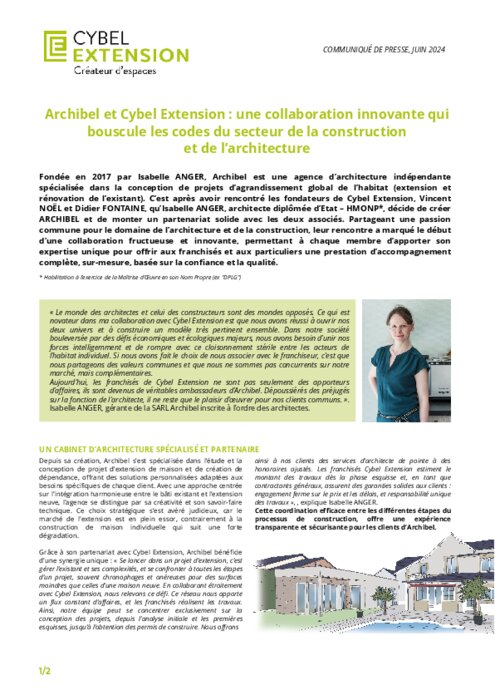 Fondée en 2017 par Isabelle ANGER, Archibel est une agence d’architecture indépendante spécialisée dans la conception de projets d’agrandissement global de l’habitat (extension et rénovation de l’existant). C’est après avoir rencontré les fondateurs de Cybel Extension, Vincent NOËL et Didier FONTAINE, qu’Isabelle ANGER, architecte diplômée d’Etat – HMONP, décide de créer ARCHIBEL et de monter un partenariat solide avec les deux associés.