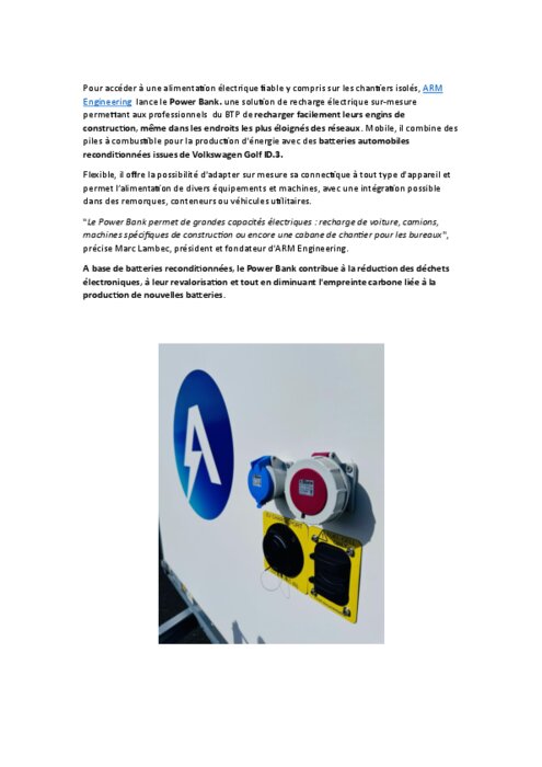 Pour accéder à une alimentation électrique fiable y compris sur les chantiers isolés, ARM Engineering lance le Power Bank. une solution de recharge électrique sur-mesure permettant aux professionnels du BTP de recharger facilement leurs engins de construction, même dans les endroits les plus éloignés des réseaux. Mobile, il combine des piles à combustible pour la production d'énergie avec des batteries automobiles reconditionnées issues de Volkswagen Golf ID.3.