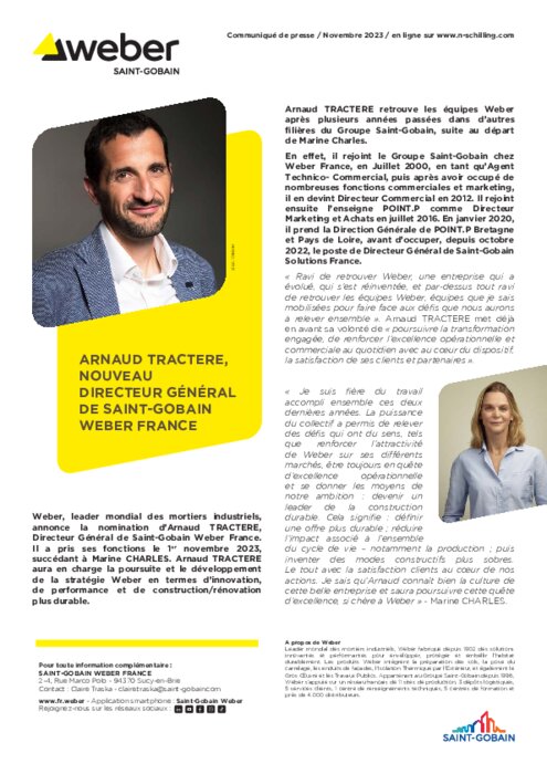 Industriels 06 novembre 2023 - 11:14 Arnaud TRACTERE retrouve les équipes Weber après plusieurs années passées dans d’autres filières du Groupe Saint-Gobain, suite au départ de Marine Charles. PDF (115 Ko) Télécharger