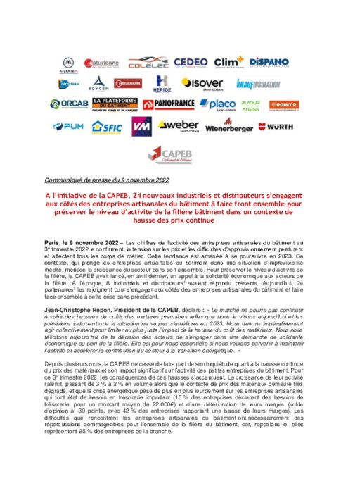 Pour préserver le niveau d’activité de la filière, la CAPEB avait lancé, en avril dernier, un appel à la solidarité économique aux acteurs de la filière. A l’époque, 8 industriels et distributeurs avaient répondu présents. Aujourd’hui, 24 partenaires les rejoignent pour s’engager aux côtés des entreprises artisanales du bâtiment et faire face ensemble à cette crise sans précédent.