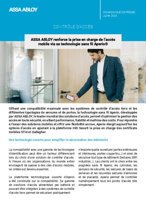 Offrant une compatibilité maximale avec les systèmes de contrôle d’accès tiers et les différentes typologies de serrures et de portes, la technologie sans fil Aperio, développée par ASSA ABLOY, le leader mondial des solutions d’accès, permet d’optimiser la gestion des accès en toute sécurité, en alliant performance, fiabilité et maîtrise des coûts.