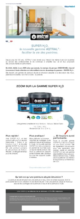 En 2024, fidèle à son ADN plus que jamais, la marque du groupe AKZONOBEL répond à nouveau aux attentes en retravaillant encore davantage la gamme « SUPER H20 ». Elle devient une gamme de peinture alkyde en émulsion adaptée à la décoration des murs, plafonds et boiseries. Son mot d’ordre : la praticité.