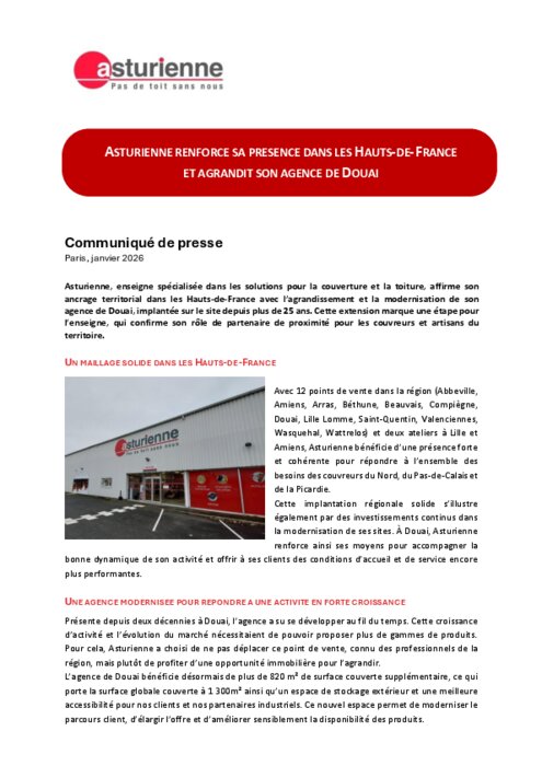 Avec 12 points de vente dans la région (Abbeville, Amiens, Arras, Béthune, Beauvais, Compiègne, Douai, Lille Lomme, Saint-Quentin, Valenciennes, Wasquehal, Wattrelos) et deux ateliers à Lille et Amiens, Asturienne bénéficie d’une présence forte et cohérente pour répondre à l’ensemble des besoins des couvreurs du Nord, du Pas-de-Calais et de la Picardie.