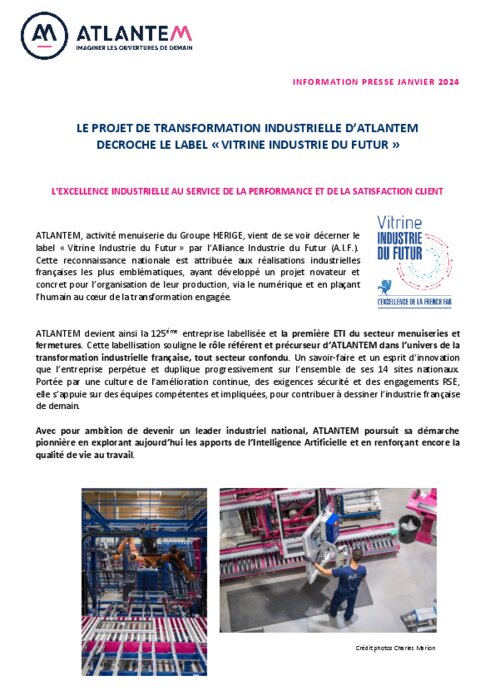 ATLANTEM, activité menuiserie du Groupe HERIGE, vient de se voir décerner le label « Vitrine Industrie du Futur » par l’Alliance Industrie du Futur (A.I.F.). Cette reconnaissance nationale est attribuée aux réalisations industrielles françaises les plus emblématiques, ayant développé un projet novateur et concret pour l’organisation de leur production, via le numérique et en plaçant l’humain au cœur de la transformation engagée.