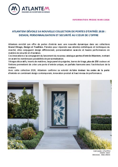 Atlantem enrichit son offre de portes d’entrée avec une nouvelle dynamique dans ses collections Grand Vitrage, Design et Tradition. Pensées pour répondre aux attentes esthétiques et techniques du marché, elles conjuguent design différenciant, personnalisation avancée et hautes performances en matière de sécurité et d’isolation.