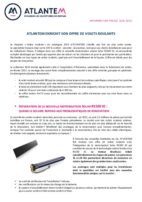 Industriels 12 juin 2023 - 08:23 Le chapitre « Volets roulants » du catalogue 2023 d’ATLANTEM s’étoffe une fois de plus cette année. Le spécialiste français mise sur le 100 % confort - sécurité - économies, tant pour ses clients installateurs que pour les utilisateurs finaux. PDF (238 Ko) Télécharger