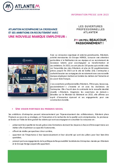 L’entreprise a souhaité booster ses campagnes de recrutement avec une nouvelle marque employeur mettant en lumière les métiers de l’industrie et du savoir-faire français. « Les ouvertures professionnelles Atlantem, J’M un peu, beaucoup, passionnément ! » s’invente et vit avec les évolutions de l’entreprise.