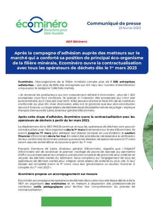 Le déploiement de la REP PMCB continue et tous les opérateurs de déchets vont pouvoir contractualiser avec l’éco-organisme dès le 1er mars directement sur le site d’Ecominéro. Ils auront jusqu’au 17 mars pour adresser leur dossier complet en vue d’obtenir le soutien financier d’Ecominéro dès le 1er mai.