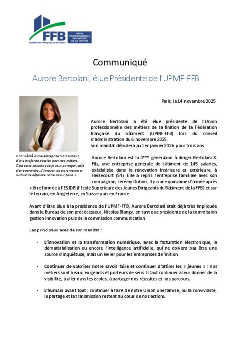 Aurore Bertolani a été élue présidente de l’Union professionnelle des métiers de la finition de la Fédération française du bâtiment (UPMF-FFB) lors du conseil d’administration du 6 novembre 2025. Son mandat débutera au 1er janvier 2026 pour trois ans. Aurore Bertolani était déjà très impliquée dans le Bureau de son prédécesseur, Nicolas Blangy, en tant que présidente de la commission gestion innovation puis de la commission communication.