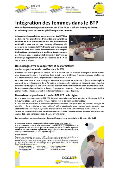 les métiers du BTP. Dans le cadre d'un projet novateur testé dans deux établissements d’Auvergne-Rhône-Alpes, cet accueil vise à améliorer le recrutement des femmes dans le secteur du Bâtiment et des Travaux Publics qui représentent