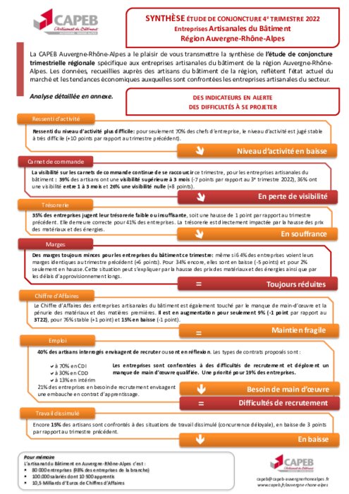 Les résultats de l’étude conduite par les CAPEB d’Auvergne-Rhône-Alpes auprès de leurs adhérents pour le 4e trimestre 2022 confirment les données publiées par la CAPEB nationale fin janvier. Le marché des entreprises artisanales du bâtiment souffre et reste perturbé par le climat socio-économique actuel. Confrontés aux problématiques de prix, d’approvisionnement, de complications administratives, les chefs d’entreprise ont de plus en plus de mal à se projeter dans les mois à venir.