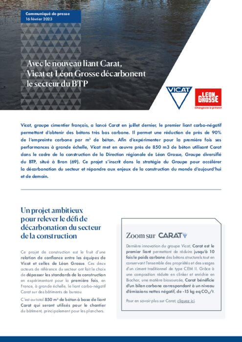 Industriels 17 février 2023 - 13:52 Vicat, groupe cimentier français, a lancé Carat en juillet dernier, le premier liant carbo-négatif permettant d’obtenir des bétons très bas carbone. Il permet une réduction de près de 90 % de l’empreinte carbone par m3 de béton. PDF (1 Mo) Télécharger