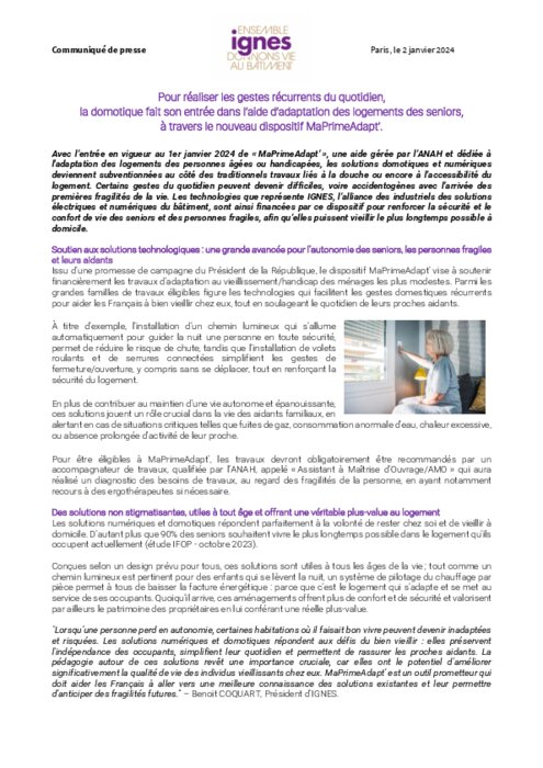 Avec l’entrée en vigueur au 1er janvier 2024 de « MaPrimeAdapt’ », une aide gérée par l’ANAH et dédiée à l'adaptation des logements des personnes âgées ou handicapées, les solutions domotiques et numériques deviennent subventionnées au côté des traditionnels travaux liés à la douche ou encore à l’accessibilité du logement.