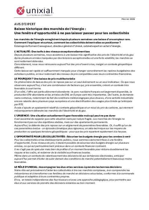 Les marchés de l’énergie enregistrent depuis plusieurs semaines une baisse d’une ampleur rare. Comment l’expliquer et surtout, comment les collectivités doivent-elles se positionner ? Éclairage de Romain Cassagnaud, directeur général d’Unixial, cabinet expert en achat d’énergie.
