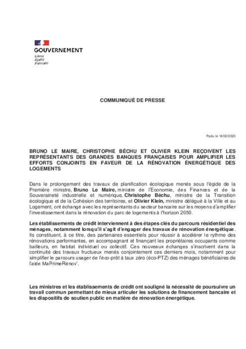 Sous l'égide de la Première ministre, le ministre de l’Économie, des Finances et de la Souveraineté industrielle et numérique, Bruno Lemaire, le ministre de la Transition écologique et de la Cohésion des territoires,