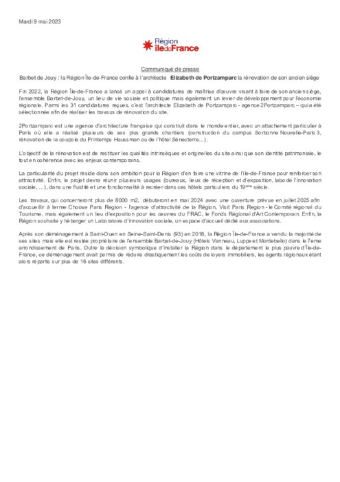 Fin 2022, la Région Île-de-France a lancé un appel à candidatures de maîtrise d’œuvre visant à faire de son ancien siège, l’ensemble Barbet-de-Jouy, un lieu de vie sociale et politique mais également un levier de développement pour l’économie régionale. Parmi les 31 candidatures reçues, c’est l’architecte Elizabeth de Portzamparc - agence 2Portzamparc – qui a été sélectionnée afin de réaliser les travaux de rénovation du site.
