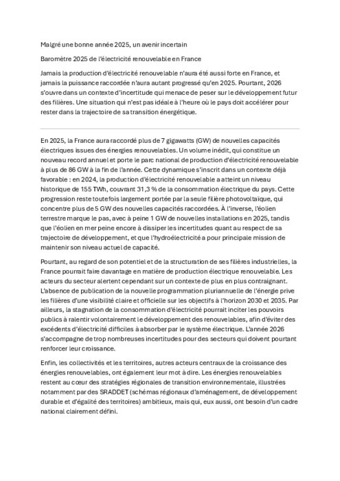 Jamais la production d’électricité renouvelable n’aura été aussi forte en France, et jamais la puissance raccordée n’aura autant progressé qu’en 2025. Pourtant, 2026 s’ouvre dans un contexte d’incertitude qui menace de peser sur le développement futur des filières. Une situation qui n’est pas idéale à l’heure où le pays doit accélérer pour rester dans la trajectoire de sa transition énergétique.