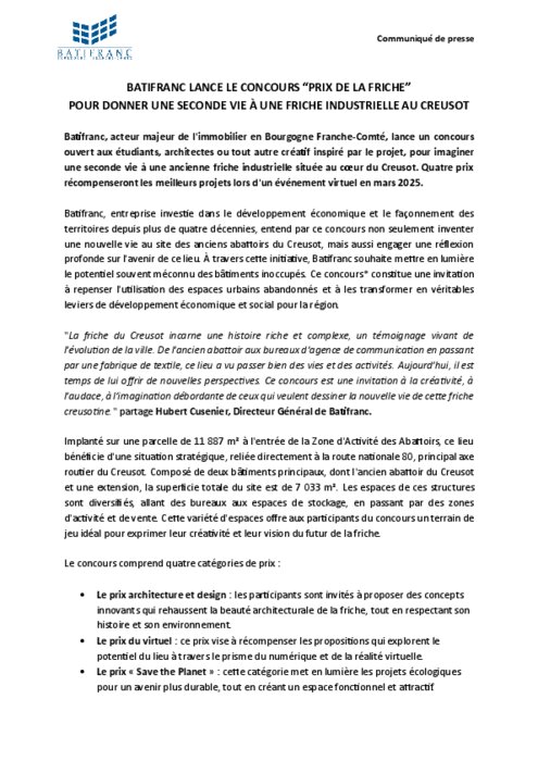 Batifranc, acteur majeur de l'immobilier en Bourgogne Franche-Comté, lance un concours ouvert aux étudiants, architectes ou tout autre créatif inspiré par le projet, pour imaginer une seconde vie à une ancienne friche industrielle située au cœur du Creusot. Quatre prix récompenseront les meilleurs projets lors d'un événement virtuel en mars 2025.