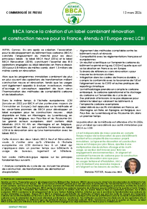 L’Association pour le développement du Bâtiment Bas Carbone (BBCA) a annoncé lors du MIPIM 2026 le lancement d'un label combinant rénovation et construction neuve.