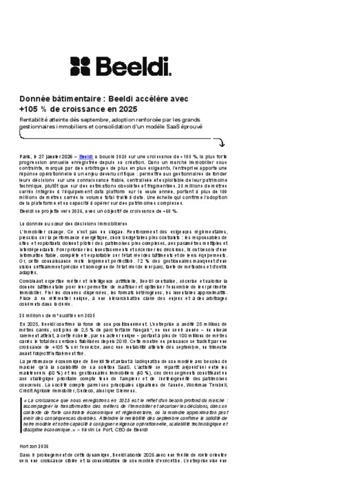 Beeldi a bouclé 2025 sur une croissance de +105 %, la plus forte progression annuelle enregistrée depuis sa création. Dans un marché immobilier sous contrainte, marqué par des arbitrages de plus en plus exigeants, l’entreprise apporte une réponse opérationnelle à un enjeu devenu critique : permettre aux gestionnaires de fonder leurs décisions sur une connaissance fiable, centralisée et exploitable de leur patrimoine technique, plutôt que sur des estimations obsolètes et fragmentées. 25 millions de mètres carrés intégrés à l’équipement data platform sur la seule année, portant à plus de 100 millions de mètres carrés le volume total traité à date. Une échelle qui confirme l’adoption de la plateforme et sa capacité à opérer sur des patrimoines complexes.
