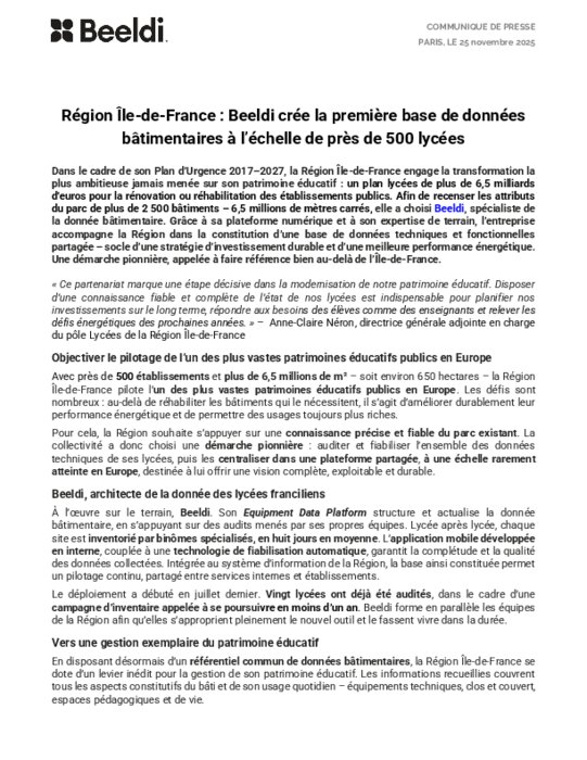 Dans le cadre de son Plan d’Urgence 2017–2027, la Région Île-de-France engage la transformation la plus ambitieuse jamais menée sur son patrimoine éducatif : un plan lycées de plus de 6,5 milliards d'euros pour la rénovation ou réhabilitation des établissements publics. Afin de recenser les attributs du parc de plus de 2 500 bâtiments – 6,5 millions de mètres carrés, elle a choisi Beeldi, spécialiste de la donnée bâtimentaire. Grâce à sa plateforme numérique et à son expertise de terrain, l’entreprise accompagne la Région dans la constitution d’une base de données techniques et fonctionnelles partagée – socle d’une stratégie d’investissement durable et d’une meilleure performance énergétique. Une démarche pionnière, appelée à faire référence bien au-delà de l’Île-de-France.
