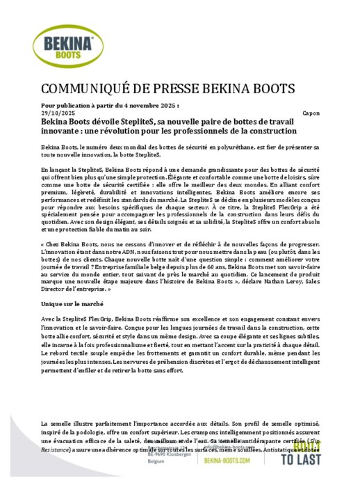 Bekina Boots dévoile sa nouvelle botte de sécurité innovante StepliteS
