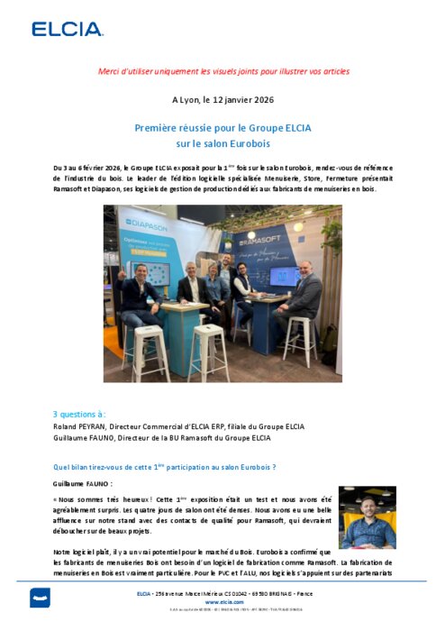 Du 3 au 6 février 2026, le groupe Elcia exposait pour la première fois sur le salon Eurobois, rendez-vous de référence de l’industrie du bois. Le leader de l’édition logicielle spécialisée Menuiserie, Store, Fermeture présentait Ramasoft et Diapason, ses logiciels de gestion de production dédiés aux fabricants de menuiseries en bois.