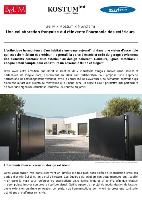 L'esthétique harmonieuse d'un habitat s'envisage aujourd'hui dans une vision d'ensemble qui associe intérieur et extérieur : le portail, la porte d’entrée et celle du garage deviennent des éléments centraux d’un extérieur au design cohérent. Couleurs, lignes, matériaux : chaque détail compte pour construire un ensemble fluide et élégant.