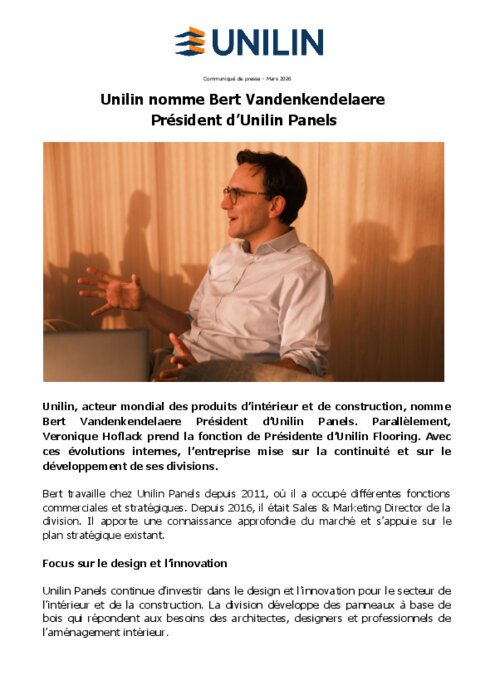 Unilin, acteur mondial des produits d’intérieur et de construction, nomme Bert Vandenkendelaere Président d’Unilin Panels. Parallèlement, Veronique Hoflack prend la fonction de Présidente d’Unilin Flooring. Avec ces évolutions internes, l’entreprise mise sur la continuité et sur le développement de ses divisions.
