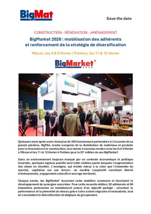 Quelques mois après avoir réuni plus de 220 fournisseurs partenaires à l’occasion de sa grande plénière, BigMat, leader européen de la distribution de matériaux et produits pour la rénovation et la construction, leur donne à nouveau rendez-vous les 4 et 5 février à Mâcon et les 11 et 12 février à Poitiers pour la 23e édition de ses BigMarket’.