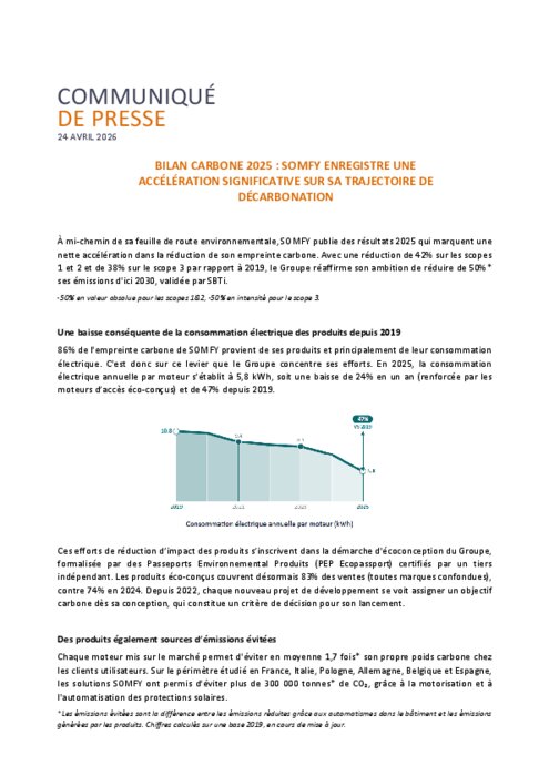 À mi-chemin de sa feuille de route environnementale, Somfy publie des résultats 2025 qui marquent une nette accélération dans la réduction de son empreinte carbone. Avec une réduction de 42% sur les scopes 1 et 2 et de 38% sur le scope 3 par rapport à 2019, le Groupe réaffirme son ambition de réduire de 50% ses émissions d'ici 2030, validée par SBTi.