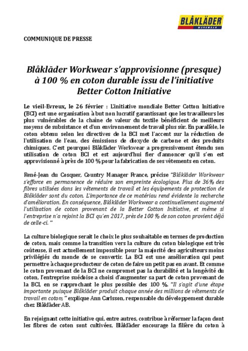 Industriels 26 février 2024 - 10:58 Blåkläder Workwear a progressivement étendu son utilisation de coton BCI et est aujourd'hui fier d'annoncer qu'il s'en est approvisionné à près de 100 % pour la fabrication de ses vêtements en coton. PDF (88 Ko) Télécharger