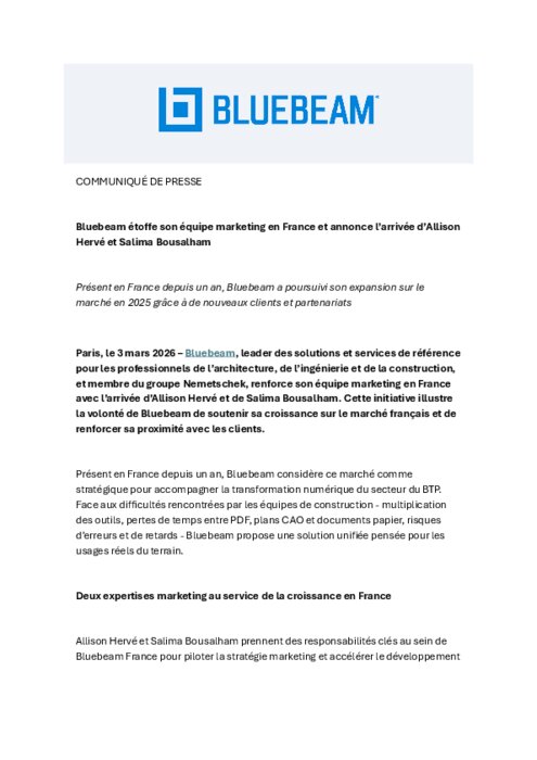 Bluebeam, leader des solutions et services de référence pour les professionnels de l’architecture, de l’ingénierie et de la construction, et membre du groupe Nemetschek, renforce son équipe marketing en France avec l’arrivée d’Allison Hervé et de Salima Bousalham. Cette initiative illustre la volonté de Bluebeam de soutenir sa croissance sur le marché français et de renforcer sa proximité avec les clients.
