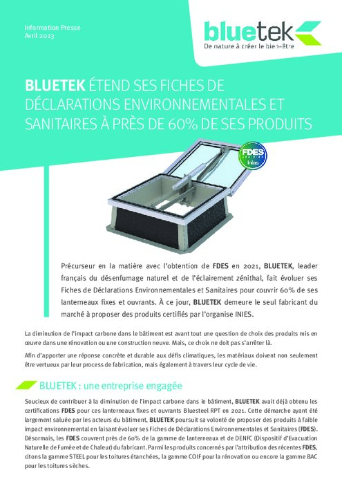Précurseur en la matière avec l’obtention de FDES en 2021, BLUETEK, leader français du désenfumage naturel et de l’éclairement zénithal, fait évoluer ses Fiches de Déclarations Environnementales et Sanitaires pour couvrir 60% de ses lanterneaux fixes et ouvrants. À ce jour, BLUETEK demeure le seul fabricant du marché à proposer des produits certifiés par l’organise INIES.