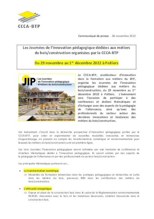 Le CCCA-BTP, accélérateur d’innovation dans la formation aux métiers du BTP, organise les Journées de l’innovation pédagogique dédiées aux métiers du bois/construction, du 29 novembre au 1 er décembre 2022 à Poitiers. L’événement sera l’occasion de participer à des conférences et ateliers thématiques et d’échanger avec des experts de la pédagogie de l’alternance, ainsi qu’avec des professionnels du secteur autour des dernières innovations et tendances des métiers du bois/construction.