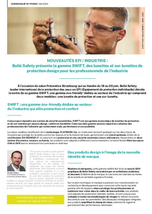 À l'occasion du salon Préventica Strasbourg qui se tiendra du 18 au 20 juin, Bollé Safety, leader international de la protection des yeux en EPI (Équipement de protection individuelle) dévoile la sortie de sa gamme SWIFT, une gamme éco-friendly dédiée au secteur de l’industrie qui comprend deux modèles : une lunette de protection et une sur-lunette.