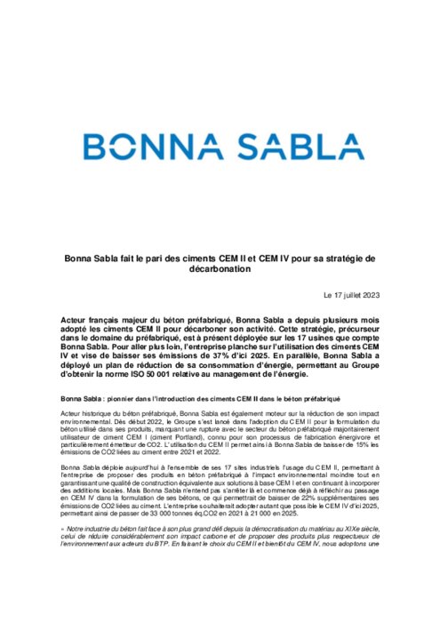 Acteur français majeur du béton préfabriqué, Bonna Sabla a depuis plusieurs mois adopté les ciments CEM II pour décarboner son activité. Cette stratégie, précurseur dans le domaine du préfabriqué, est à présent déployée sur les 17 usines que compte Bonna Sabla. Pour aller plus loin, l’entreprise planche sur l’utilisation des ciments CEM IV et vise de baisser ses émissions de 37% d’ici 2025.