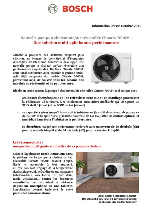 Attaché à proposer des solutions toujours plus efficaces, en termes de bien-être et d’économies d’énergies, Bosch Home Comfort a développé une nouvelle pompe à chaleur air/air réversible aux performances optimales. Baptisée Climate 7000M, cette unité extérieure vient enrichir la gamme multisplit déjà composée du modèle Climate 5000M, permettant ainsi de couvrir tous les besoins des marchés du résidentiel et du petit tertiaire.