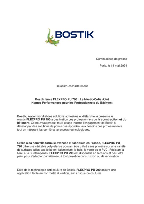 Bostik, leader mondial des solutions adhésives et d'étanchéité présente le mastic FLEXPRO PU 790 à destination des professionnels de la construction et du bâtiment. Ce nouveau produit multi-usage incarne l'engagement de Bostik à développer des solutions de pointe qui répondent aux besoins des professionnels tout en intégrant les dernières avancées technologiques.