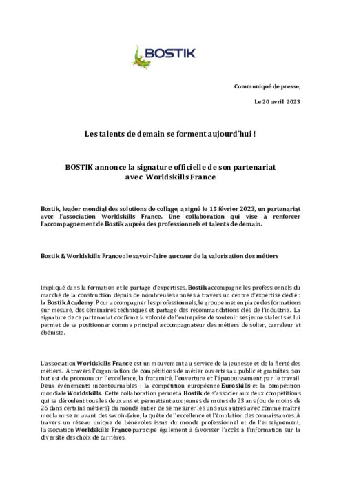 Industriels 20 avril 2023 - 09:24 Bostik, leader mondial des solutions de collage, a signé le 15 février 2023, un partenariat avec l’association Worldskills France. Une collaboration qui vise à renforcer l’accompagnement de Bostik auprès des professionnels et talents de demain. PDF (289 Ko) Télécharger