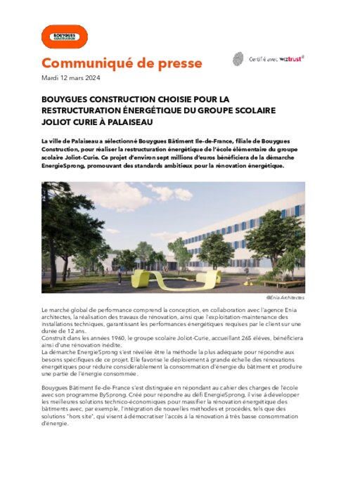 La ville de Palaiseau a sélectionné Bouygues Bâtiment Ile-de-France, filiale de Bouygues Construction, pour réaliser la restructuration énergétique de l’école élémentaire du groupe scolaire Joliot-Curie. Ce projet d’environ sept millions d’euros bénéficiera de la démarche EnergieSprong, promouvant des standards ambitieux pour la rénovation énergétique.
