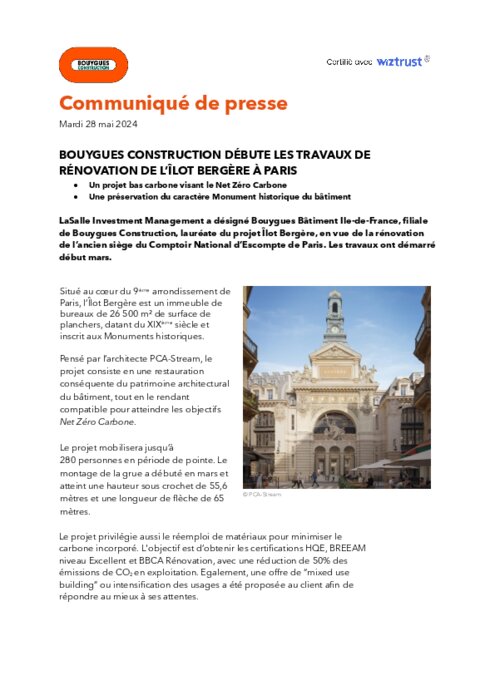 LaSalle Investment Management a désigné Bouygues Bâtiment Ile-de-France, filiale de Bouygues Construction, lauréate du projet Îlot Bergère, en vue de la rénovation de l’ancien siège du Comptoir National d’Escompte de Paris. Les travaux ont démarré début mars.